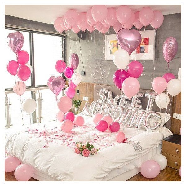 Marry me or Wedding balloon, 30 pcs helliam balloon, rose petals on bed, 20 pcs balloon on floor, 30 stk rose bouquet